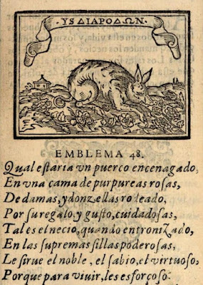 En el análisis iconográfico dedicado a este emblema, Juan de Dios Hernández Miñano nos relata la presencia de este fantástico animal en la literatura clásica, bíblica y patrística, junto a los idearios simbólicos y morales que lo han acompañado en diferentes contextos históricos. También en la parte final conjetura sobre cómo Covarrubias pudo servirse de esa imagen para dirigir una crítica solapada al sistema asambleario del Cabildo de la Catedral de Cuenca, en cuyas interminables controversias se viera tantas veces involucrado siendo maestrescuela.