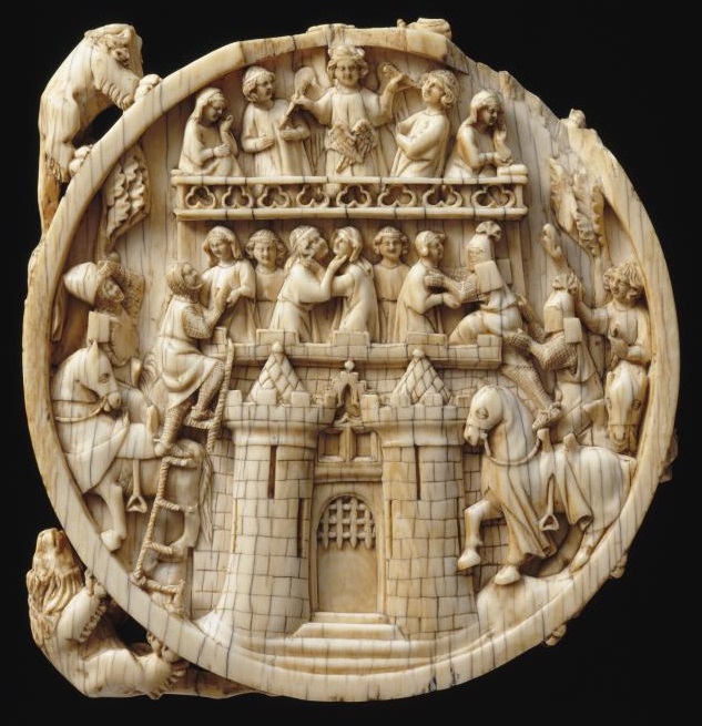 La fórmula iconográfica tradicionalmente denominada Castillo del Amor se define por la distribución de un conjunto de mujeres en lo más alto de un castillo, las cuales, de forma cooperativa, interactúan con los hombres que se encuentran en el exterior, bien para defenderse de su ataque arrojando flores o, tras una breve lucha más o menos violenta entre ambos sexos, invitarles a acceder al castillo donde en ocasiones encontramos a las parejas ya reunidas. En algunas piezas datadas a finales del siglo XIV, el dios alado Amor preside la escena. Creemos que el significado de esta imagen, tradicionalmente interpretada desde el punto de vista del cortejo amoroso cortesano, debió tener en un principio un propósito muy diferente del que terminó poseyendo, y que estaría más en la dirección del poder de las mujeres en la salvaguarda de su integridad física sexual cuando estas actúan en comunidad. Por ello creemos que quizá el título que correspondería a esta iconografía sería el Asalto al castillo de las damas y proponemos que únicamente en el caso de las representaciones en las que el dios Amor preside la escena y las parejas de amantes están unidas, es cuando propiamente podríamos denominar la escena Castillo del Amor.